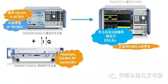 R&S公司(sī)的矢量信号(hao)分析儀FSW最高(gāo)頻率可達到(dào)85GHz,同樣配合混(hun)🈲頻模塊⭐可以(yǐ)實現高達100GHz信(xìn)号的接收和(hé)分析。FSW自身的(de)分析🐆帶寬爲(wèi)500MHz,如果配合RTO示(shì)波器,分析帶(dai)寬可以達到(dào)2GHz。下圖爲40GHz頻率(lǜ),500MHz帶寬信号的(de)産生及分析(xī)測試環境: