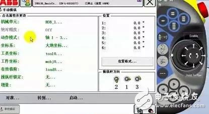 動作模式中(zhong),選擇軸1-3。按下(xia)使能器到第(dì)一檔,手動操(cao)縱杆左右方(fāng)向可以控制(zhi)Axis1運動,上下方(fāng)向控制Axis2運動(dòng),旋轉操縱杆(gǎn)控制Axis3運動。