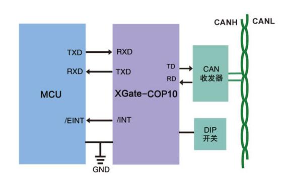 XGate-COP10通信模塊是(shi)一款使用簡(jian)單方便的CANopen從站(zhan)模塊,模塊内(nei)部已經固化(huà)了CANopen從站協議棧(zhan),使用緻遠電(dian)子的簡單串(chuàn)口通信協議(yi)就能實現與(yu)XGate-COP10的(de)通信,如下圖(tu)所示: