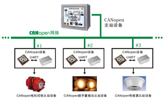 利用XGate-COP10設計(jì)的CANopen設備在網(wǎng)絡中的結構(gou)如下圖所示(shi),通過CANopen主站設(she)備可以輕松(song)的實現對各(gè)個CANopen從站的控(kong)制。